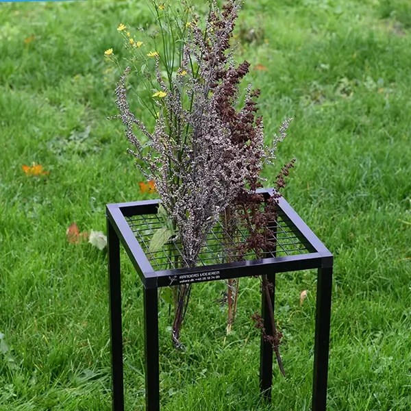 Praktisk frugt- og grøntstativ med bredmasket net, der gør det nemt at anrette ukrudt, friske kviste eller frugt til fuglene.